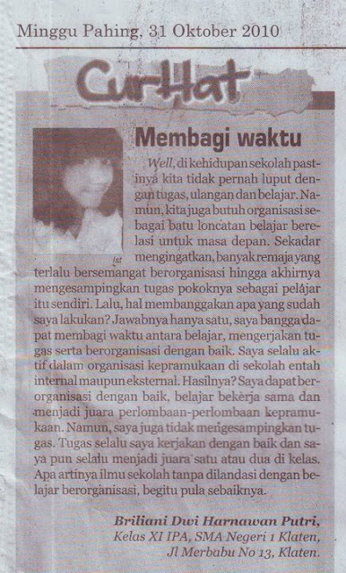 Lalu, hal membanggakan apa yang sudah saya lakukan ? Jawabnya hanya satu, saya bangga dapat membagi waktu antara belajar, mengerjakan tugas serta berorganisasi dengan baik. Saya selalu aktif dalam organisasi kepramukaan di sekolah entah internal maupun ekternal. Hasilnya ? Saya dapat berorganisasi dengan baik, belajar bekerja sama dan menjadi juara diperlombaan - perlombaan kepramukaan. Namun, saya juga tidak mengesampingkan sekolah. Tugas selalu saya kerjakan dengan baik dan saya pun selalu menjadi juara satu atau dua di kelas. Apa artinya ilmu sekolah tanpa dilandasi dengan belajar berorganisasi, begitu pula sebaliknya.