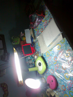 | Lampu kamar kosku rusak. Aku terpaksa memakai dua lampu belajar ini selama tiga hari. |