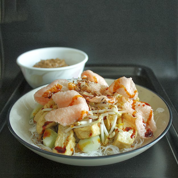 | Untuk yang tidak tahu ketoprak, ini dia Ketoprak! Lontong, tahu, bihun, taoge, timun yang dibalur dengan bumbu kacang dan kecap, lengkap dengan segunung kerupuk. (sumber gambar) |